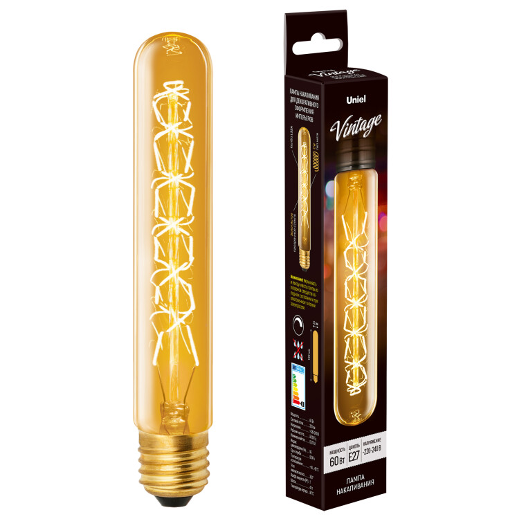IL-V-L32A-60/GOLDEN/E27 CW01 Лампа накаливания Vintage. Форма «цилиндр», длина 185 мм. Форма нити CW. Картон. ТМ Uniel