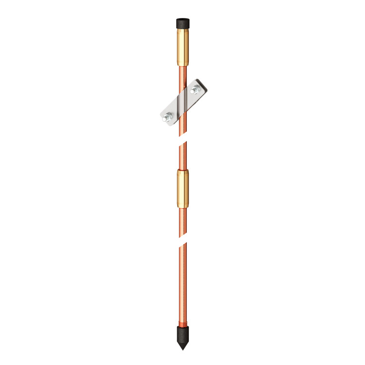 Назначение омедненного вертикального заземлителя – организация заземления токоотводов молниезащиты или электрического оборудования. Общая длина – 3000 мм, материал – омедненная сталь, диаметр – 14,2 мм. Средняя толщина медного покрытия стержней не менее 250 мкм. Стержни соединяются между собой с помощью вкручиваемых соединительных муфт. Комплект включает в себя: вертикальный заземлитель, 1500 мм – 2 шт; соединитель проводника – 1 шт; соединительная муфта – 2 шт; наконечник – 1 шт; забивной винт – 1 шт.