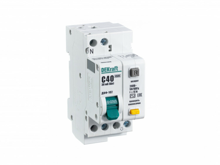 Автоматический выключатель дифференциального тока серии ДИФ-102 Dekraft; 1P+N; ном.ток 40 А; характеристика C; откл.способность Icn = 4,5 kA; ток утечки 30 мА; тип - АС; блок дифф.защиты – электронный; ширина – 2 мод. х 18 мм; монтаж – на DIN-рейку. АВДТ применяются в сетях напряжением до 220 В пер.тока для защиты человека от поражения электрическим током и электроустановок от сверхтоков и токов утечки. Аппараты ДИФ-102 являются более компактным вариантом АВДТ по сравнению с серией ДИФ-101.