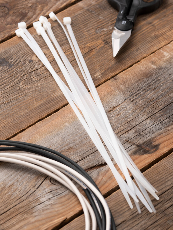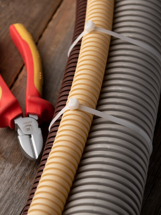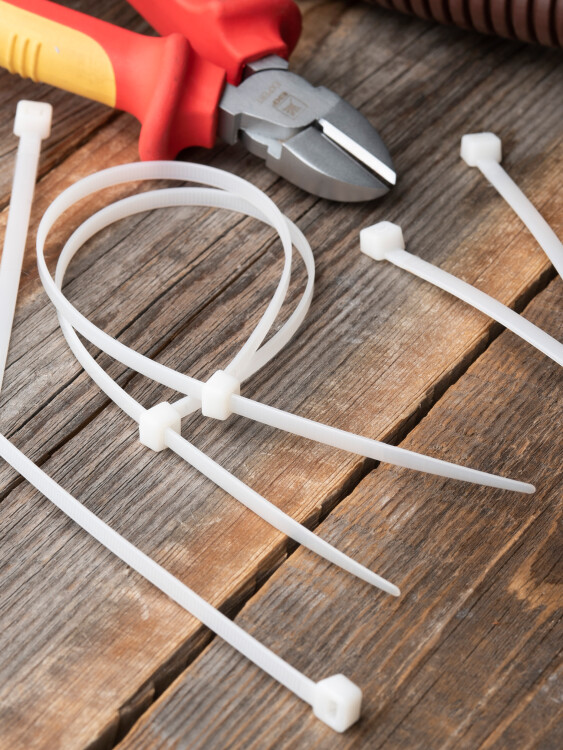 Предназначен для увязки кабелей и проводов в пучок и монтажа кабельных линий и проводников. Ремешок самофиксирующийся, блокирующий механизм. Изготовлен из Nylon 6.6, устойчивого к старению, коррозии, воздействию солей, ультрафиолета, кислот, щелочей, спирта, бензина и масел. При производстве кабельных стяжек черного цвета добавляется угольный порошок, который является одним из наиболее эффективных стабилизаторов. Он улучшает физические свойства продукции в стойкости к погодным условиям и УФ-излучению (прямые солнечные лучи).