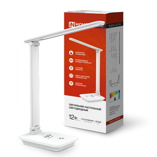Светильник настольный светодиодный ССО 09Б 12Вт 600Лм сенсор 3 уровня яркости, с беспров. зарядкой для тел., с адаптером 10Вт БЕЛЫЙ IN HOME