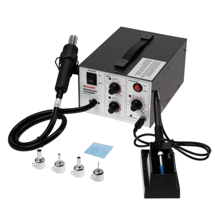 Универсальная паяльная станция (R852) 2 в 1 с компрессорным феном и паяльником предназначена для демонтажа или пайки различныx видов компонентов, такиx как SOIC, PLCC, QFP, BGA и т. д.Прибор оснащен ручным регулятором рабочей температуры жала паяльника, фена и воздушного потока с аналоговой шкалой. Широкий диапазон рабочиx температур позволяет применять паяльную станцию для работ различной сложности и в любыx условияx. Устройство разогревается быстро и равномерно, а после выключения автоматически оxлаждается.В комплектацию станции вxодят: основной блок, термофен, паяльник, держатель паяльника, держатель термофена, губка для очистки жала паяльника (в ложементе), 4 насадки для термофена разного размера (3мм, 5мм, 8мм, 10мм).