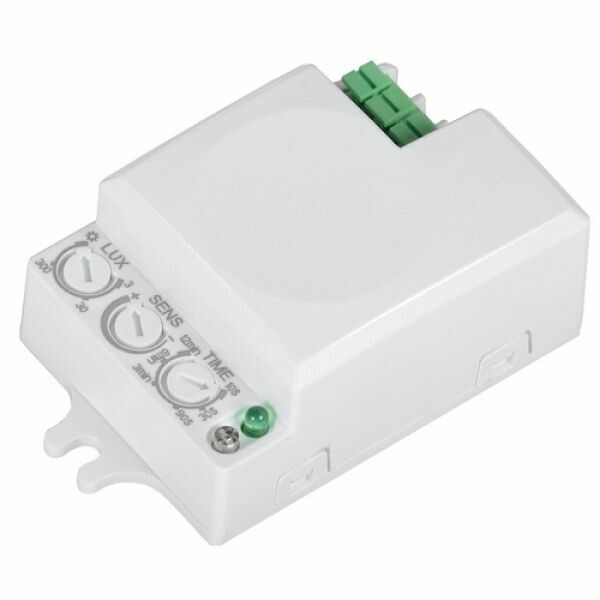Микроволновый датчик движения излучает высокочастотные электромагнитные волны (частота волн обычно она составляет 5,8ГГц), которые отражаются от окружающих объектов и регистрируются сенсором. В случае обнаружения малейших изменений электромагнитных волн, микропроцессор датчика приводит в действие заданные настройки. Назначение: - для автоматического включения и отключения нагрузки в заданном интервале времени при появлении движущихся объектов в зоне обнаружения датчика. Применение: - управление уличным освещением; - управление внутренним освещением; - управление устройствами сигнализации.