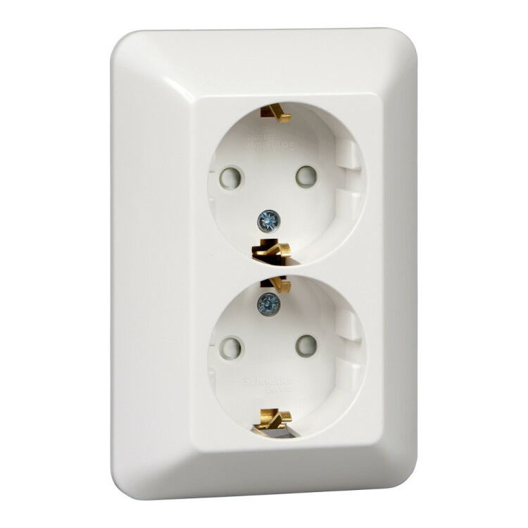 Розетка двойная Schneider Electric ПРИМА (скрытой установки, цвет белый) с заземлением и со шторками предназначена для сетей до 250 В на ток до 16 А.