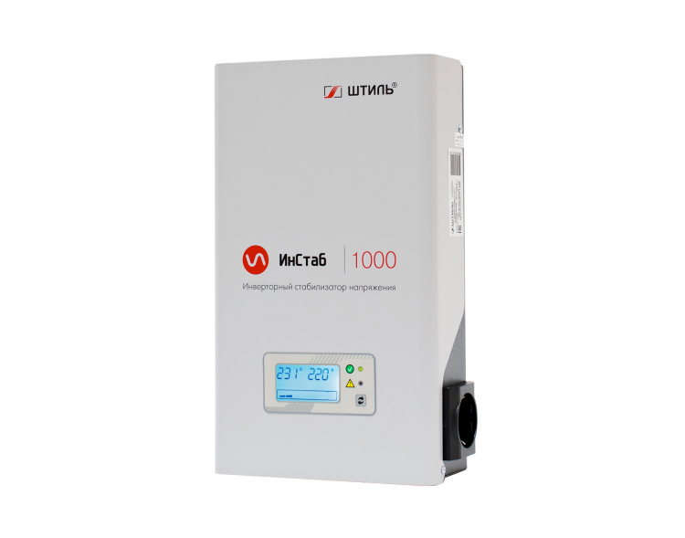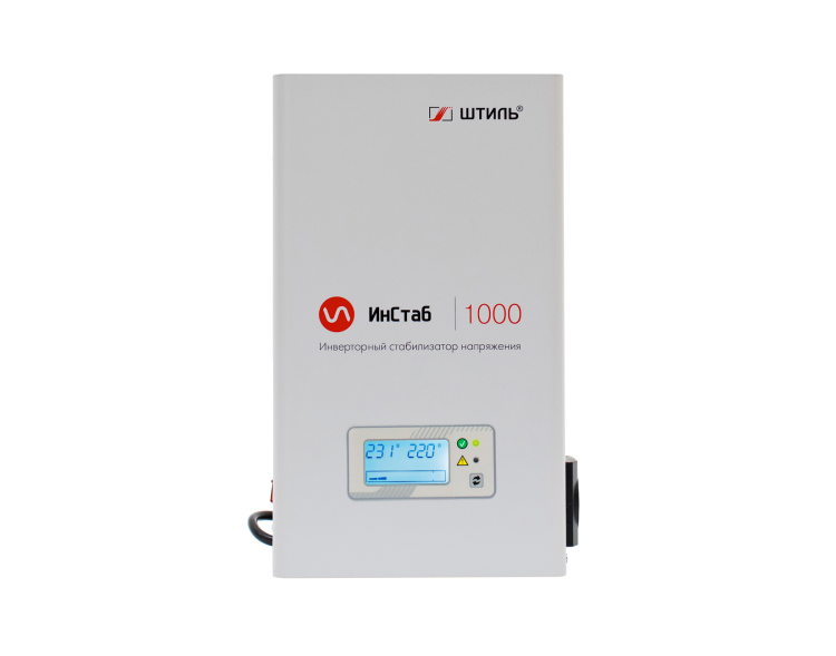 Инверторный стабилизатор напряжения Штиль IS1000 устройство нового поколения, принцип работы которого основан на технологии двойного, бестрансформаторного преобразования энергии. Он предназначен для защиты от повышенного и пониженного входного напряжения однофазных электроприборов с потребляемой мощностью не более 1000 ВА/750 Вт, например, отопительного оборудования, телевизоров, ПК, аудио- и видеотехники. Стабилизатор выполнен в универсальном конструктиве для настенной или настольной установки. Он подключается к сети с помощью кабеля длиной 1,3 м с трёхполюсной вилкой. Для подключения нагрузки на боковой панели предусмотрены две EURO розетки с заземлением. На передней панели расположены ЖК-дисплей и два светодиодных индикатора, которые позволяют контролировать основные параметры входной и выходной сети, состояние и режим работы стабилизатора. Предусмотрена электронная аварийная защита от короткого замыкания, импульсных помех, перегрузки, перегрева и аварии сети.