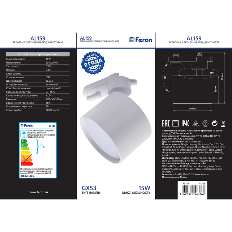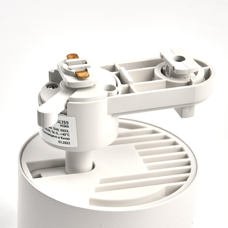 Светильники трековые на шинопровод GX53, однофазный (ИВО) FERON AL159, 15W, 230V, цвет белый, корпус алюминий, вращение →350°/↓90°, 80*80*105 мм
