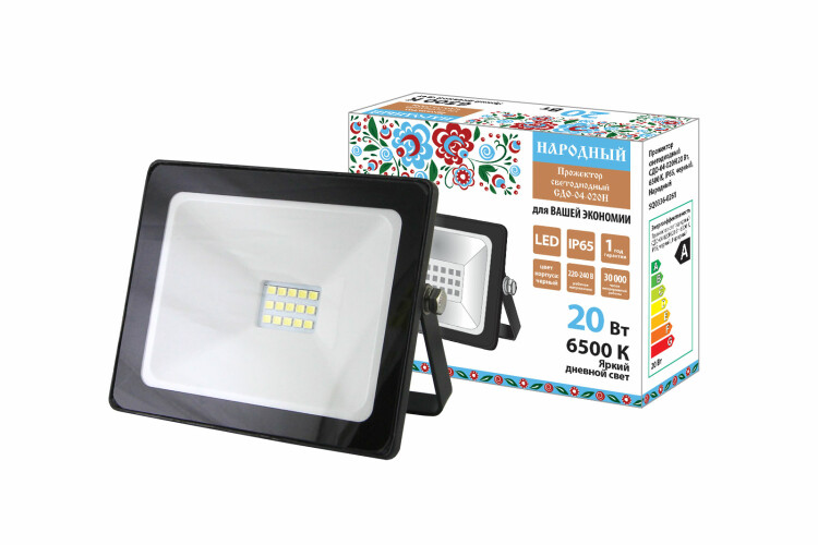 Прожектор светодиодный СДО-04-020Н 20 Вт, 6500 К, IP65, черный, Народный