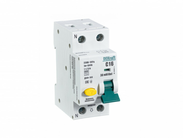 Автоматический выключатель дифференциального тока серии ДИФ-103 Dekraft; 1P+N; ном.ток 16 А; характеристика C; откл.способность Icn = 6 kA; ток утечки 30 мА; тип - А; блок дифф.защиты – электронный; ширина – 2 мод. х 18 мм; монтаж – на DIN-рейку. АВДТ применяются в сетях напряжением до 220 В пер.тока для защиты человека от поражения электрическим током и электроустановок от сверхтоков и токов утечки. Аппараты ДИФ-103 являются более компактным вариантом АВДТ по сравнению с серией ДИФ-101.