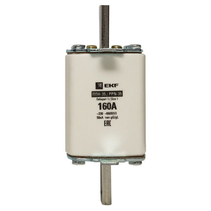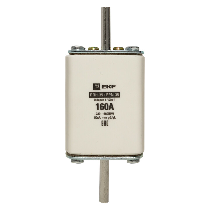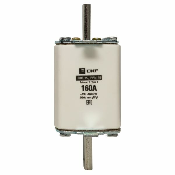 Плавкая вставка ППН-35 250/160А габарит 1 EKF. Предохранители плавкие ППН EKF, укомплектованные плавкими вставками типа gG/gL, предназначаются для защиты кабельных линий и промышленных электроустановок от токов перегрузки и короткого замыкания. Предохранители применяются в электрических сетях переменного тока частотой 50 Гц с напряжением до 660В. Применяются для крепления в распределительных и вводно-распределительных устройствах. Предохранители плавкие ППН могут устанавливаться в основание с держателем, а также в специально предназначенные рубильники. В комплект поставки предохранителей плавких ППН основание с держателем не входит и приобретается отдельно.