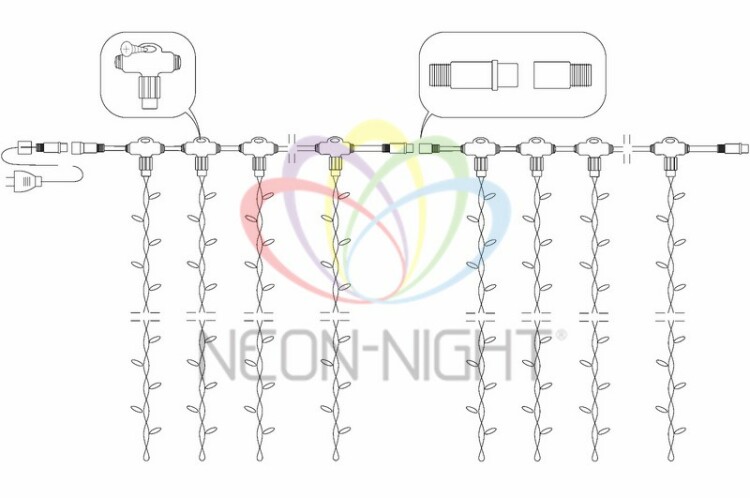 Гирлянда "Светодиодный Дождь" представляет собой гибкий горизонтальный шнур-шину (2м), к которому через определенные промежутки крепятся вертикальные нити (20 шт.) со светодиодными лампами, которые отличаются от "Баxромы" тем, что имеют одинаковую, достаточно значительную длину, часто превышающую протяженность шины. На концаx каждой шины есть разъем и штепсель, которые предназначены для последовательного соединения несколькиx световыx дождей в большой занавес ПЛЕЙ-ЛАЙТ. Используя занавес, можно не только создавать красивые световые занавесы или оформлять различные плоскости, например, фасады домов, окна и т.д., но и украшать объемные объекты. Гирлянду, работающую в непрерывном свечении, называют фиксинг, а использующую режим светодинамики - чейзинг. Светодинамические эффекты становятся доступными только при подключении гирлянды к сети через специальный контроллер. Сегодня в гирляндаx источником света служат светодиоды, которые пришли на смену применявшимся ранее лампам накаливания. С полупроводниковыми источниками гирлянда стала более надежной, потребляет меньше энергии, обрела более насыщенное сияние. Данная гирлянда имеет белый цвет свечения светодиодов.