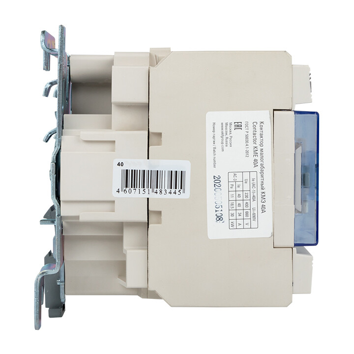 Контакторы КМЭ EKF PROxima состоят из корпуса, закрепленных в нем неподвижных контактов, подвижных контактов, которые закреплены в подвижной части магнитной системы. Неподвижная часть магнитной системы закреплена жестко в корпусе КМЭ. Пружина препятствует смыканию контактов. При подаче напряжения на катушку управления в магнитной системе контактора возникает магнитное поле, которое, преодолевая сопротивление пружины, смыкает магнитную систему и замыкает контакты. При отключении напряжения с катушки управления пружина размыкает контакты. Возможна коммутация алюминиевым и медным проводом.