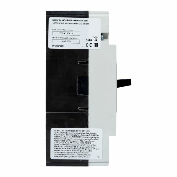 Выключатель ВА-99М выполнен в виде моноблока и состоит из основания и крышки с фальшпанелью, в которой имеется окно для рукоятки управления и толкатель кнопки «Тест» - проверки механизма отключения выключателя. Основание выполнено из термостойкой пластмассы, не поддерживающей горение и являющейся несущей конструкцией для присоединительных зажимов, неподвижных и подвижных контактов с системой дугогашения, механизма управления, блока защиты от сверхтоков. Крышка закрывает все подвижные элементы механизма управления и внутренние токоведущие части.