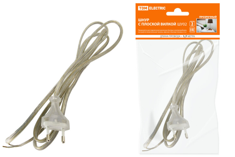 Шнур бра с плоской вилкой 1,7м (ШВВП 2х0,75мм2) прозрачный ШУ02 TDM (1/80шт)