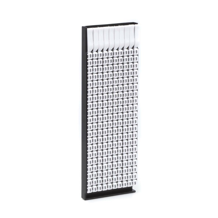 Ручная маркировка системы MARK 3 для маркировки проводов без разъединения электрической цепи из полиамида 6.6. Температура эксплуатации от –40 до +100 °С. Боковые штифты надежно фиксируют соединение друг с другом и позволяют добиться точного выравнивания маркеров. Цвет маркеров соответствует международной кодировке. Символ "9" черным цветом на белом маркере для сечения провода 4-6 мм2. 160 маркеров в упаковке.