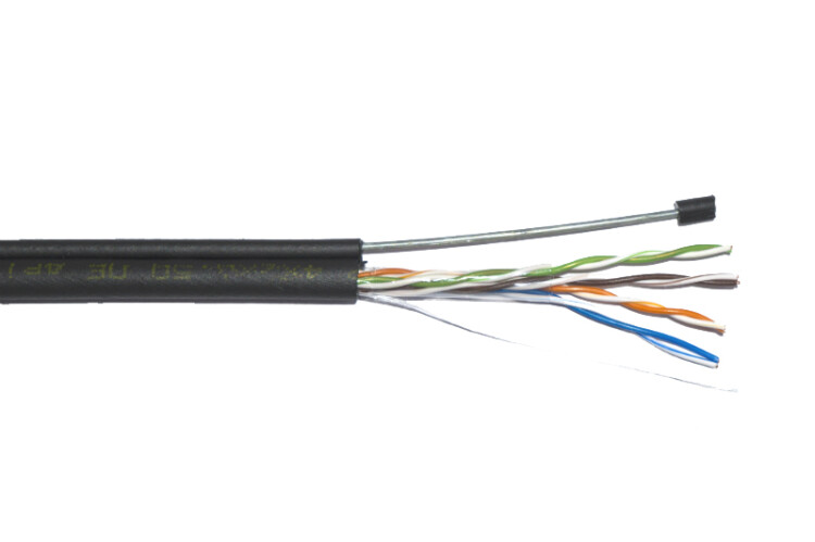 Кабель ITK категории 5е для внешней прокладки 4х парный U/UTP в оболочке LDPE с цельнометаллическим тросом диаметром 1.2мм, цвет черный. Применяется для построения структурированных кабельных систем, локальных вычислительных сетей, для общей коммуникационной инфраструктуры между зданиями, для магистральных подсистем и для организации уличной «последней мили».