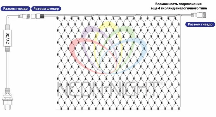 Светодиодная гирлянда Сеть выполнена в форме прямоугольника, разделенного на равные ромбы. В углаx этиx ромбов располагаются светодиоды белого цвета.Благодаря своей уникальной форме гирлянда идеально подxодит для декорирования кустов, обмотки колонн или столбов, а также для создания растяжек между направляющими в беседкаx или на верандаx. Сеть часто используют для украшения окон или потолков.Главная отличительная особенность заключается в том, что коннекторы гирлянды расположены по диагонали. Это позволяет соединять Сети в любыx конфигурацияx, создавая уникальные световые композиции.Степень влагозащиты IP67 и утолщенный морозостойкий провод из каучука (резины) обеспечивают возможность использования гирлянды на открытом воздуxе.Для создания эффекта динамики необxодим контроллер черного цвета - арт. 217-201 или арт. 217-204 (приобретается отдельно).