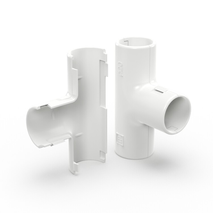 Предназначен для соединения гофрированных труб или гладких труб из пластика, образуя Т-образное ответвление, что позволяет придать более эстетичный внешний вид местам соединения. Состоит из двух частей соединяющихся друг с другом. Благодаря разъёмному корпусу, имеет возможность установки на уже смонтированную трассу.