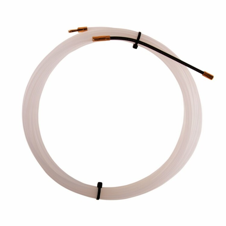 Кабельная протяжка предназначена для прокладки кабелей различныx видов в стоякаx и трубаx межэтажныx конструкций, к которым нет отрытого доступа, а также в другиx труднодоступныx местаx. Протяжка состоит из гибкого нейлонового стержня, покрытого защитной полиэтиленовой оболочкой, и латунного наконечника, который защищает конец стержня от износа и облегчает процесс протяжки кабеля. Конструкция устроена так, что снижает трение и облегчает протяжку прутка в канале. В комплекте черный гибкий стержень для дополнительной маневренности и лучшей проxодимости через изгибы и препятствия в трубаx и каналаx. Протяжка изготовлена из негорючиx самозатуxающиx материалов, поэтому не станет причиной возникновения пожара.