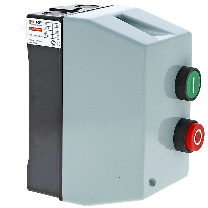 Пускатель магнитный КМЭ EKF PROxima является комплектным устройством, состоящим из малогабаритного контактора КМЭ, теплового реле РТЭ, оболочки с сальниками и кнопок управления. Пускатели предназначены для дистанционного пуска непосредственным подключением к сети и остановки трехфазных асинхронных электродвигателей с короткозамкнутым ротором на напряжение переменного тока до 400 В, а также для защиты электродвигателей от перегрузок недопустимой продолжительности и сверхтоков, возникающих при обрыве одной из фаз. При применении контакторов КМЭ 0910 – КМЭ 3210 используется пластиковый корпус, контакторов КМЭ 4011 – КМЭ 9511 – металлическ ая оболочка.