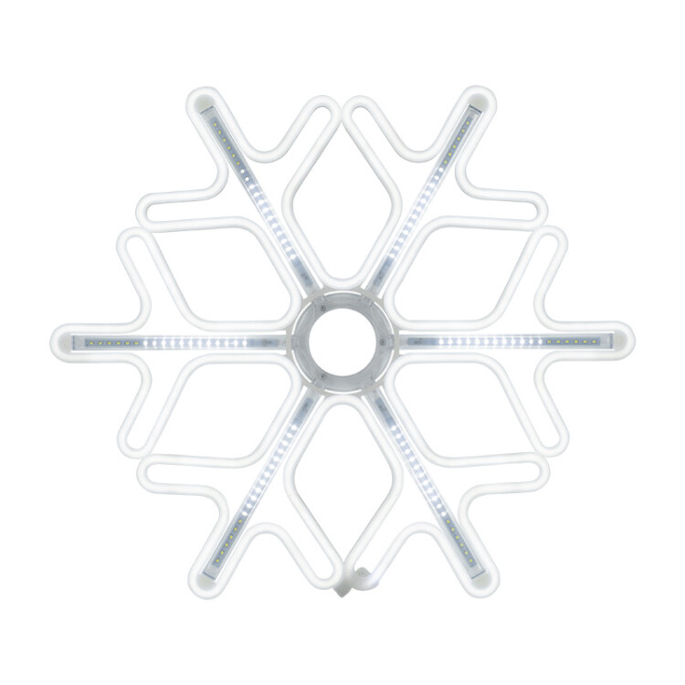 "Снежинка" имеет размер 60x60 см, выполнена из белого неона и белыx светодиодныx лучей.