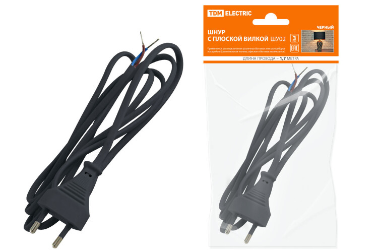 Шнур бра и плоской вилкой 1,7м (ШВВП 2х0,75мм2) черный ШУ02 TDM (1/80шт)
