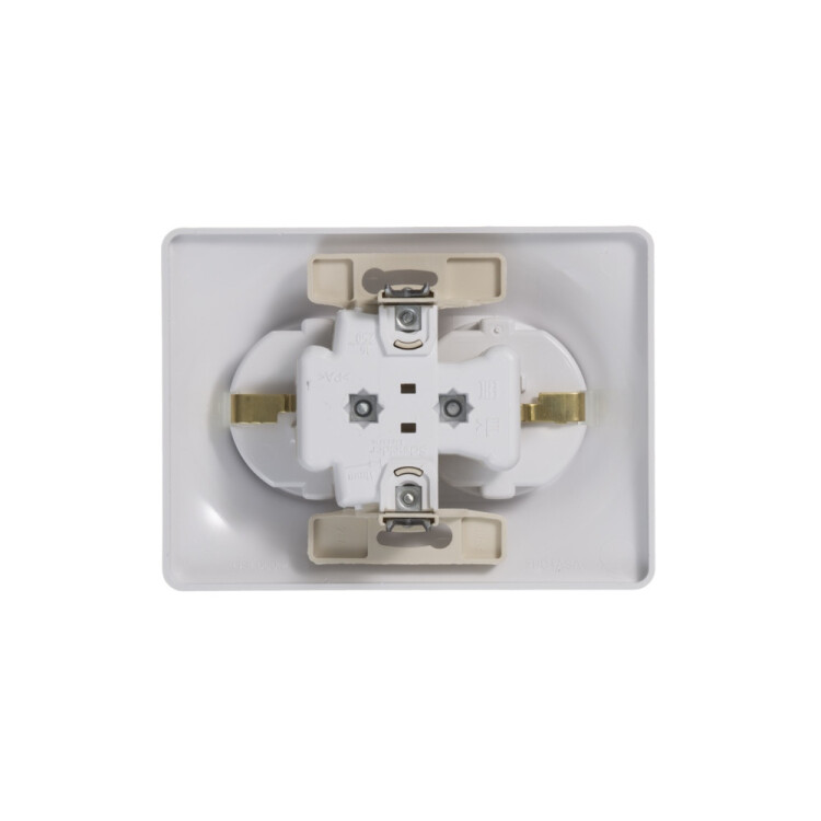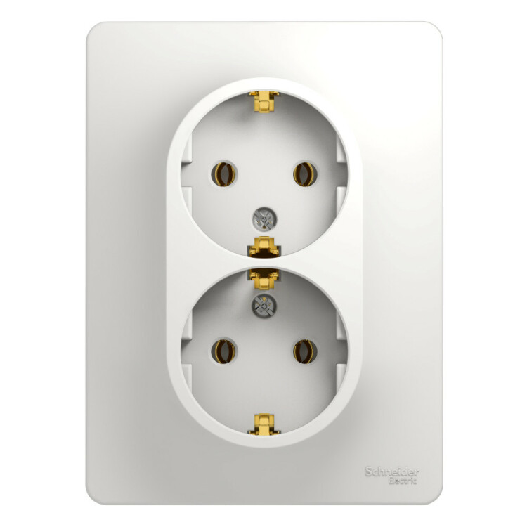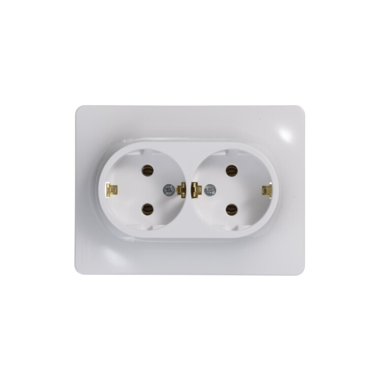 Розетка двойная Systeme Electric (ранее Schneider Electric) серии Glossa (в сборе, цвет белый) с заземлением, без шторок подходит для сетей 250 В, на ток 16 А. - Заземляющий контакт обеспечивает дополнительную защиту от удара электрическим током. При наличии заземления электрический потенциал уходит в землю, защищая человека. - Выполнен из материала PС+ASA, стойкого к УФ-излучению и появлению царапин. - Двойная розетка позволяет подключить два устройства в одном месте.
