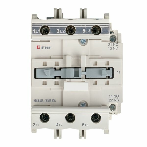Контакторы КМЭ EKF PROxima состоят из корпуса, закрепленных в нем неподвижных контактов, подвижных контактов, которые закреплены в подвижной части магнитной системы. Неподвижная часть магнитной системы закреплена жестко в корпусе КМЭ. Пружина препятствует смыканию контактов. При подаче напряжения на катушку управления в магнитной системе контактора возникает магнитное поле, которое, преодолевая сопротивление пружины, смыкает магнитную систему и замыкает контакты. При отключении напряжения с катушки управления пружина размыкает контакты. Возможна коммутация алюминиевым и медным проводом.