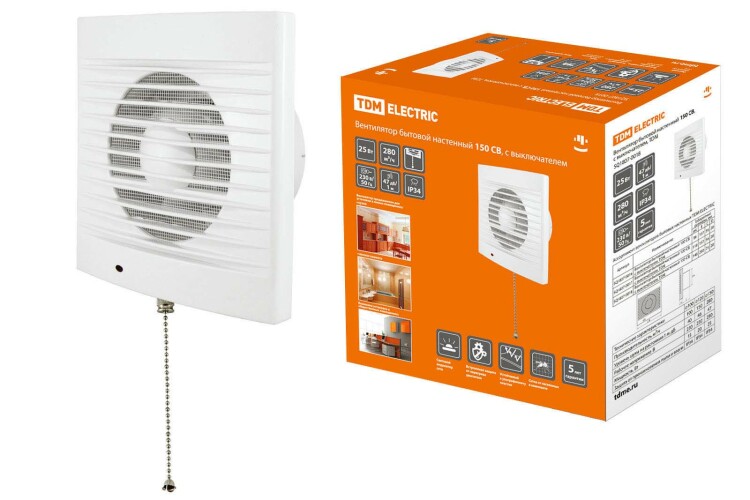 Вентилятор настенный для вытяжки с цепочкой-выключателем D150мм СВ белый TDM (1/10шт)