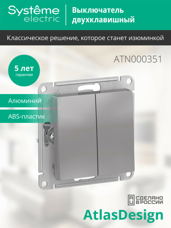 Механизм Systeme Electric (ранее Schneider Electric) серии AtlasDesign в цвете алюминий выключателя 2-клавишного подходит д ля сетей 250 В, на ток 10 А.