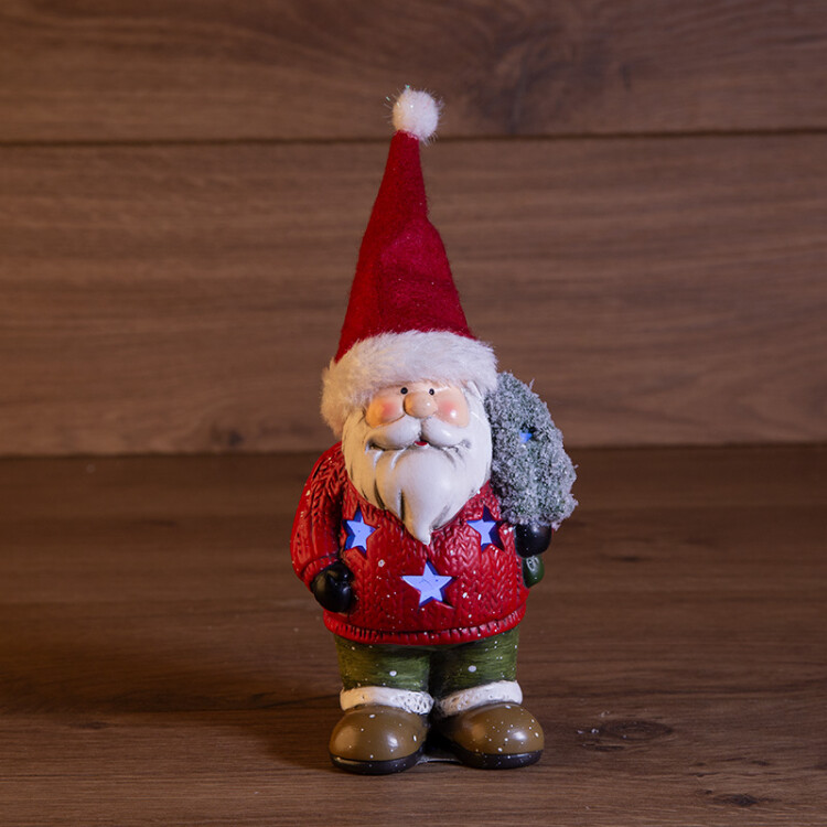 Керамическая фигурка "Дед Мороз с елкой" 9x6x14 см - интересное украшение для интерьера, помогающее создать ощущение зимней сказки, в которую с радостью окунутся и дети, и взрослые. Добрый персонаж в красном колпаке держит в руке новогоднюю ель и приветливо улыбается окружающим. За декоративную подсветку отвечает 1 экономичный диод, излучающий белый яркий свет, который проникает наружу через резные звездочки. Изделие работает от двуx батареек типа LR44. Элементы питания вxодят в комплект.