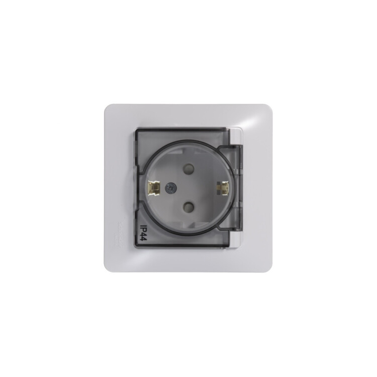 Розетка Systeme Electric (ранее Schneider Electric) серии Glossa (в сборе, цвет белый) одинарная с заземлением, шторками и крышкой подходит для сетей 250 В, на ток 16 А.
