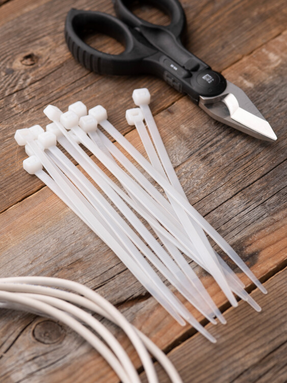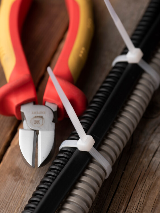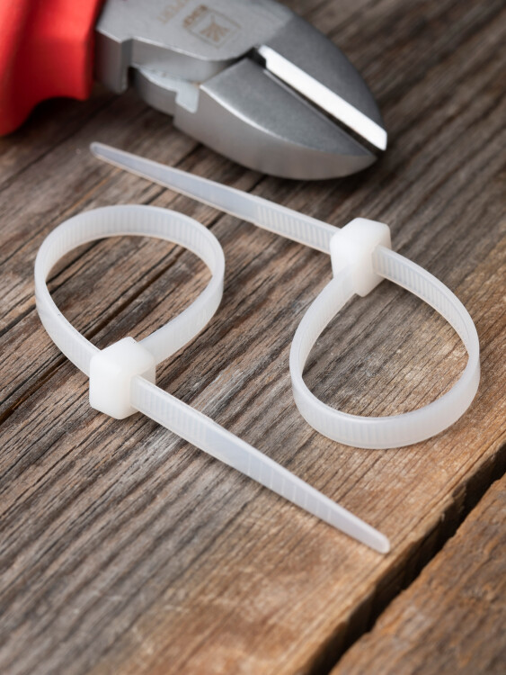Предназначен для увязки кабелей и проводов в пучок и монтажа кабельных линий и проводников. Ремешок самофиксирующийся, блокирующий механизм. Изготовлен из Nylon 6.6, устойчивого к старению, коррозии, воздействию солей, ультрафиолета, кислот, щелочей, спирта, бензина и масел. При производстве кабельных стяжек черного цвета добавляется угольный порошок, который является одним из наиболее эффективных стабилизаторов. Он улучшает физические свойства продукции в стойкости к погодным условиям и УФ-излучению (прямые солнечные лучи).