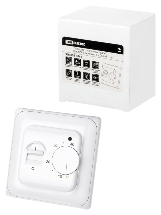 Назначение: Для поддержания заданной температуры пола в помещениях, оборудованных системой электрического обогрева «тёплый пол». Применение: Жилые помещения (дома, квартиры и т.д.). Инфраструктурные объекты (больницы, школы и т.д.). Объекты коммерческой недвижимости (офисы, торговые центры и т.д.). Преимущества: Точная регулировка температуры пола. Датчик температуры пола длиной 3 метра в комплекте. Контроль расхода электроэнергии. Упаковка: Картонная коробка с чёрно-белым информационным стикером