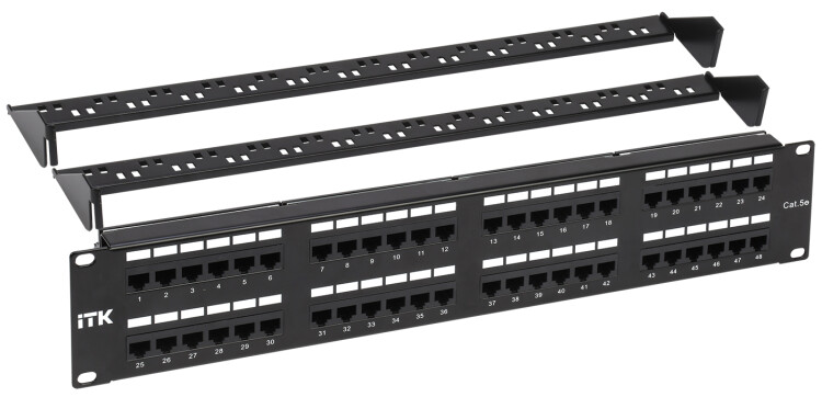 Коммутационные панели или патч-панели являются важнейшей частью любой СКС и IT-инфраструктуры здания и сооружения с большим количеством информационных розеток и терминальных портов конечных пользователей, которые необходимо коммутировать на порты активного сетевого оборудования, размещенного в серверных и распределительных узлах. В зависимости от способа крепления, масштабности кабельной системы, типа сети ITK изготавливает патч-панели для настенного монтажа или монтажа в 19-дюймовый конструктив, по количеству портов: 12-, 24-, 25-, 48-, 50-, категорий: 3 (телефонные), 5E, 6, 6A, в экранированном исполнении и без защитного экрана. Патч-панели для монтажа в 19" шкаф или стойку соответствуют стандарту 19" (482,6 мм), имеют отверстия с левой и правой стороны для крепления на профиль, производятся высотой 0,5, 1 или 2 юнита. На передней стороне все патч-панели ITK имеют специальную площадку для дополнительной маркировки и цифровую нумерацию портов, на обратной стороне модули IDC имеют цветовую и цифровую нумерацию. Также для облегчения монтажа и укладки кабелей имеются изделия с кабельным органайзером спереди или сзади. Патч-панели соответствуют международным стандартам UL 1863, ISO/IEC 11801:2002, TIA/EIA-568-B, кодировка проводников в соответствии с T568B и A. Поставляются в картонной коробке с крепежом.