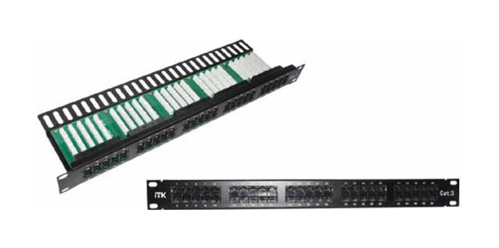 Коммутационные панели или патч-панели являются важнейшей частью любой СКС и IT-инфраструктуры здания и сооружения с большим количеством информационных розеток и терминальных портов конечных пользователей, которые необходимо коммутировать на порты активного сетевого оборудования, размещенного в серверных и распределительных узлах. В зависимости от способа крепления, масштабности кабельной системы, типа сети ITK изготавливает патч-панели для настенного монтажа или монтажа в 19-дюймовый конструктив, по количеству портов: 12-, 24-, 25-, 48-, 50-, категорий: 3 (телефонные), 5E, 6, 6A, в экранированном исполнении и без защитного экрана. Патч-панели для монтажа в 19" шкаф или стойку соответствуют стандарту 19" (482,6 мм), имеют отверстия с левой и правой стороны для крепления на профиль, производятся высотой 0,5, 1 или 2 юнита. На передней стороне все патч-панели ITK имеют специальную площадку для дополнительной маркировки и цифровую нумерацию портов, на обратной стороне модули IDC имеют цветовую и цифровую нумерацию. Также для облегчения монтажа и укладки кабелей имеются изделия с кабельным органайзером спереди или сзади. Патч-панели соответствуют международным стандартам UL 1863, ISO/IEC 11801:2002, TIA/EIA-568-B, кодировка проводников в соответствии с T568B и A. Поставляются в картонной коробке с крепежом.