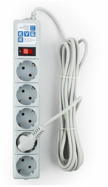 Сетевой фильтр 5 гнезд с/з с выключателем 5м 10А 250В (ПВС 3х0,75мм2) серый Power Cube