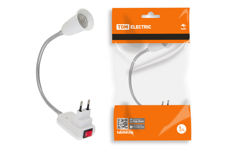 Переходник вилка-Е27 гибкий с выключателем 300мм белый TDM