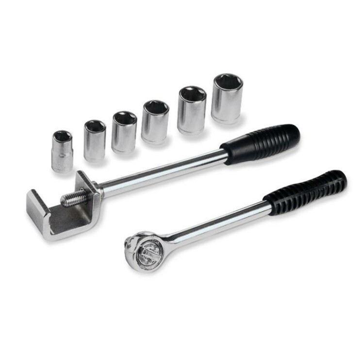 В комплекте: струбцина из хромированной стали для фиксации наконечников и соединителей.реверсивный ключ-трещотка на 1/2.6 сменных головок с внутренним шестигранником: 8, 10, 12, 14, 17, 19 мм.тканевая сумка.Диапазон сечений монтируемых наконечников и соединителей: 10400 мм2.Возможно использование струбцины для разворота и ориентирования жил кабеля.Вес комплекта: 1.30 кг.Длина струбцины: 290 мм.