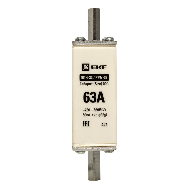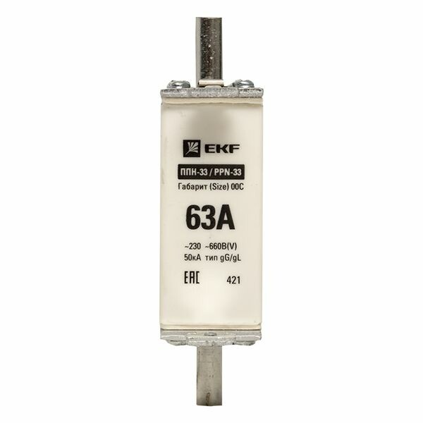 Плавкая вставка ППН-33 100/ 63А габарит 00С EKF. Предохранители плавкие ППН EKF, укомплектованные плавкими вставками типа gG/gL, предназначаются для защиты кабельных линий и промышленных электроустановок от токов перегрузки и короткого замыкания. Предохранители применяются в электрических сетях переменного тока частотой 50 Гц с напряжением до 660В. Применяются для крепления в распределительных и вводно-распределительных устройствах. Предохранители плавкие ППН могут устанавливаться в основание с держателем, а также в специально предназначенные рубильники. В комплект поставки предохранителей плавких ППН основание с держателем не входит и приобретается отдельно.