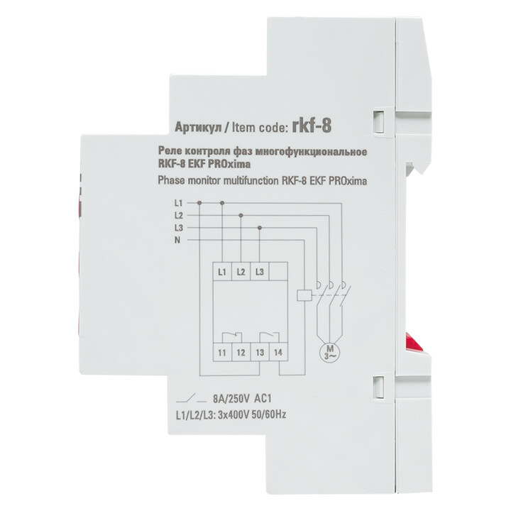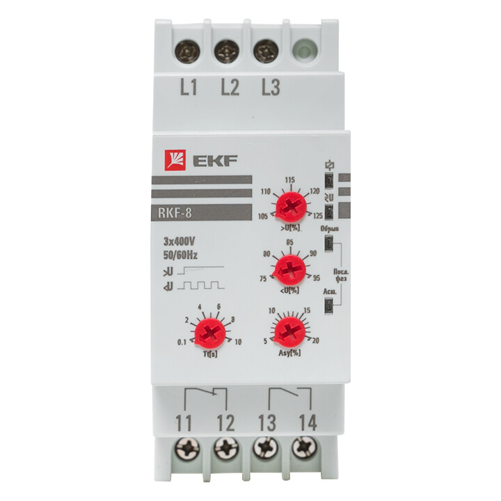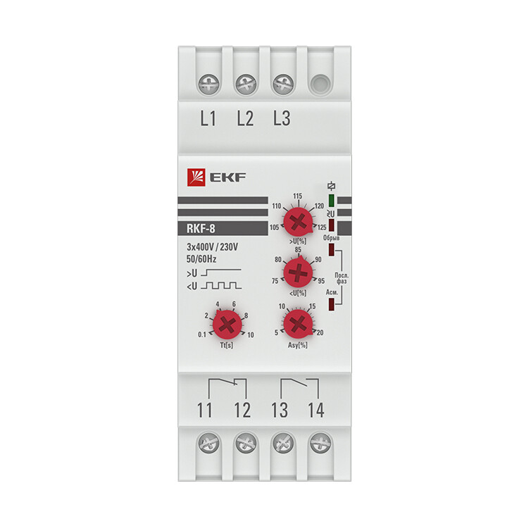 Многофункциональное реле контроля фаз PROxima является устройством, созданным на базе микроконтроллера. Реле применяется в системах автоматизации и предназначено для высокоточного контроля качества питания сети в электроустановках до 1000 В переменного тока трехфазной сети. Реле контролирует следующие параметры: • отсутствие фаз; • падение напряжения (кроме rkf-11, rkf-31); • повышение напряжения (кроме rkf-11, rkf-31); • асимметрия напряжения с выдержкой времени срабатывания (кроме rkf-11, rkf-34, rkf-31); • чередование фаз;