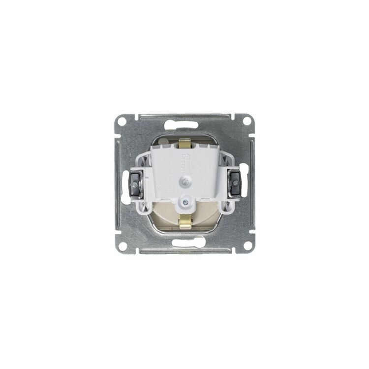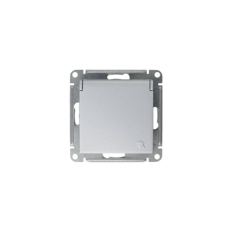 Механизм Systeme Electric (ранее Schneider Electric) серии AtlasDesign в цвете алюминий розетки одинарной с заземлением, шт орками и крышкой подходит для сетей 250 В, на ток 16 А.
