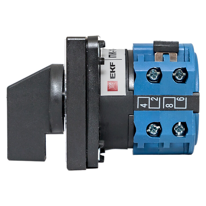 Кулачковые переключатели ПК EKF PROxima представляют собой механические коммутационные аппараты. Рассчитаны на применение в цепях переменного тока номинальным напряжением до 400 В и частотой 50/60 Гц. Благодаря повышенному содержанию серебра в контактах достигается их пониженное переходное сопротивление и повышенная устойчивость к воздействию внешней среды. Выпускается несколько исполнений кулачковых переключателей: • ПК-1 – стандартный кулачковый переключатель с различными схемами коммутации и разным количеством полюсов; • ПК-2 – трехфазный кулачковый переключатель с усовершенствованной контактной группой (выключатель нагрузки); • ПК-3 – трехфазный кулачковый переключатель в защитном боксе IP 54 (выключатель нагрузки). Переключатели ПК-1 и ПК-2 выпускаются с передним креплением. Устанавливаются на переднюю панель щитового оборудования, пульт управления и т. п. Переключатели ПК-3 с задним креплением устанавливаются на монтажную панель.