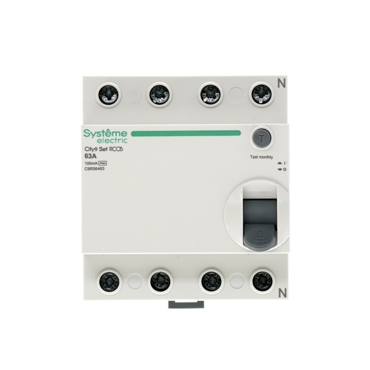 Выключатель дифференциального тока (ВДТ) или устройство защитного отключения (УЗО) серии City9 Set Systeme Electric, 4-полюсны й, номинальный ток 63А, ток утечки 100 мА, тип АС, электромеханический. Применяется в электрических сетях напряжением 400В. Уставка по току утечки 100 мА обеспечивает гарантированную защиту людей при прямом и косвенном прикосновении. Кнопка тест обеспечивает проверку работоспособности аппарата. Крепление на DIN-рейку шириной 35 мм. Подключение сверху и снизу. Безопасные клеммы.