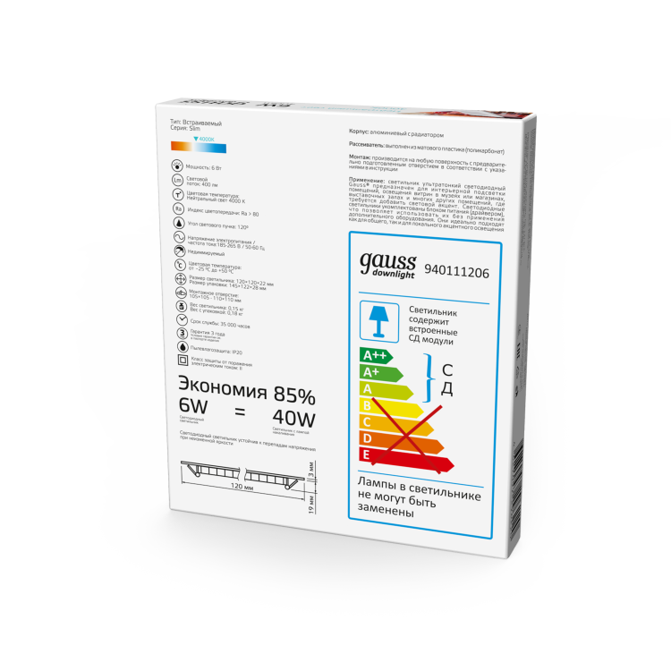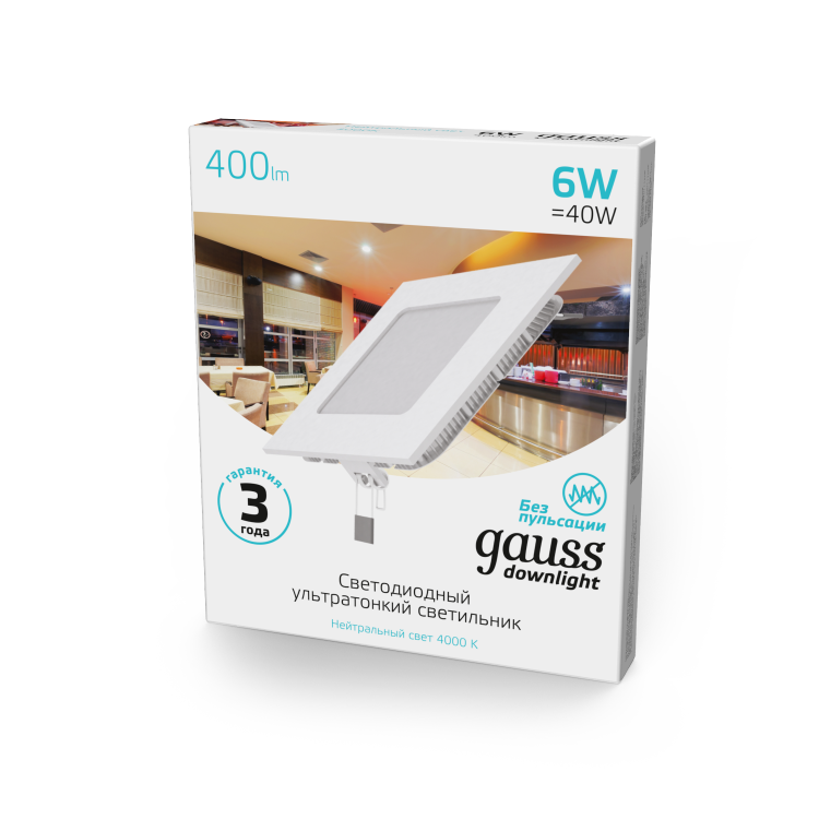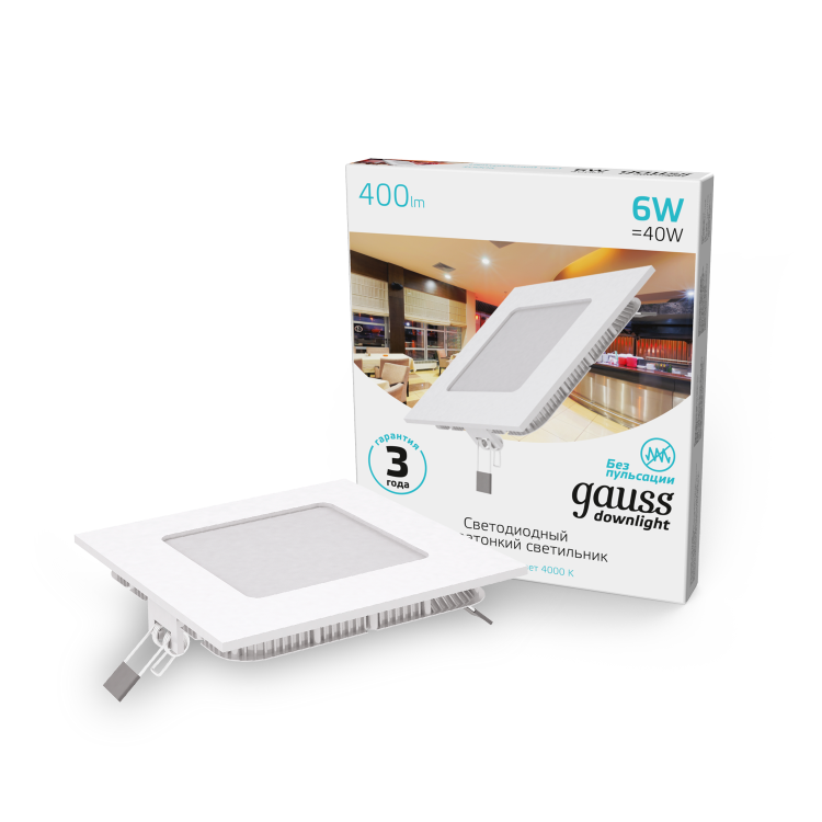 Светильник ультратонкий встраиваемый Gauss Slim Downlight квадрат 6w, соответствует лампе накаливания 40w. Цвет корпуса белый, выполнен из прочного пластика, линза - аналог опалового стекла. Внешний вид - нейтральный, может быть уместен во многих современных дизайнах. Он подойдет как для неоклассики или прованса, так и для минималистичного, лофт или хай-тек интерьеров. Этот светильник хорошо встает в небольшую монтажную глубину, так как сам всего 2.2 см. Цветовая температура 4000К (нейтральный белый свет не искажающий цветовосприятие), может быть использован в любой комнате с IP20, в том числе в прихожей над зеркалом для макияжа.