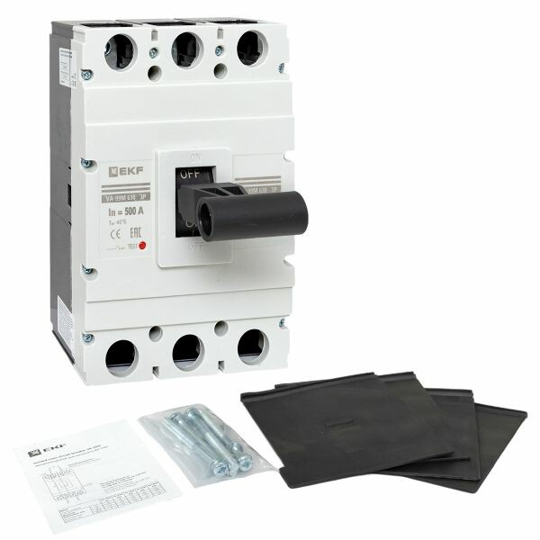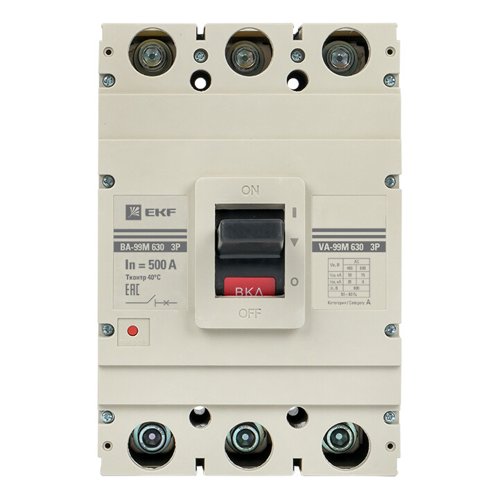 Выключатель ВА-99М выполнен в виде моноблока и состоит из основания и крышки с фальшпанелью, в которой имеется окно для рукоятки управления и толкатель кнопки «Тест» - проверки механизма отключения выключателя. Основание выполнено из термостойкой пластмассы, не поддерживающей горение и являющейся несущей конструкцией для присоединительных зажимов, неподвижных и подвижных контактов с системой дугогашения, механизма управления, блока защиты от сверхтоков. Крышка закрывает все подвижные элементы механизма управления и внутренние токоведущие части.