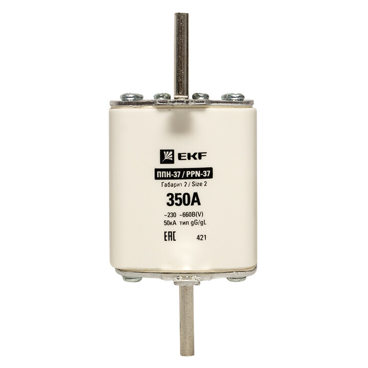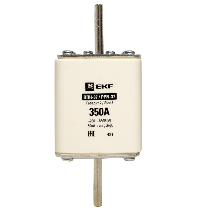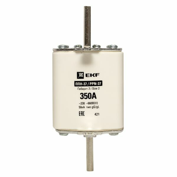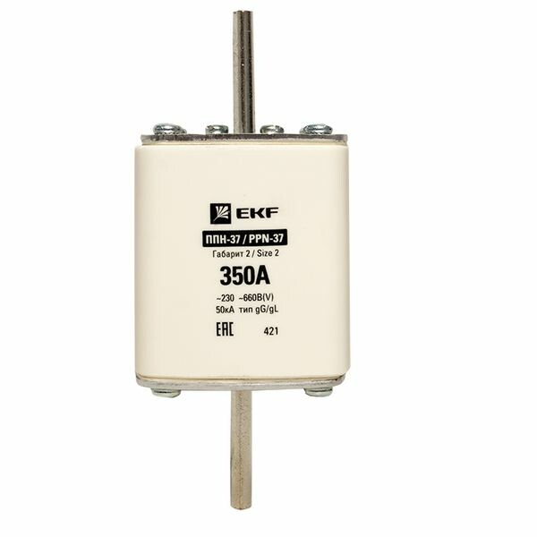 Плавкая вставка ППН-37 400/350А габарит 2 EKF. Предохранители плавкие ППН EKF, укомплектованные плавкими вставками типа gG/gL, предназначаются для защиты кабельных линий и промышленных электроустановок от токов перегрузки и короткого замыкания. Предохранители применяются в электрических сетях переменного тока частотой 50 Гц с напряжением до 660В. Применяются для крепления в распределительных и вводно-распределительных устройствах. Предохранители плавкие ППН могут устанавливаться в основание с держателем, а также в специально предназначенные рубильники. В комплект поставки предохранителей плавких ППН основание с держателем не входит и приобретается отдельно.