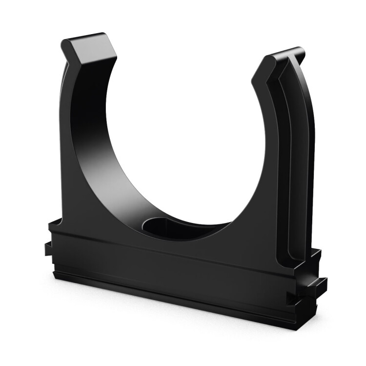 Предназначена для крепления гладких труб ПВХ или гофрированных труб одного диаметра к поверхности стен, потолков, полов или перегородок. Для монтажа предусмотрено технологическое отверстие под дюбель или саморез. Для удобства блочного монтажа состыковываются друг с другом с помощью специальных фиксаторов типа «ласточкин хвост».