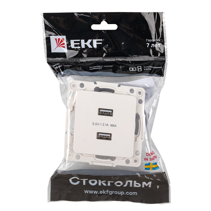 Розетка с 2 USB EKF серии Стокгольм станет отличным решением для квартиры и загородного дома для подключения устройств. USB-разъемы позволяют подлючить мобильные устройства напрямую, без адаптера. Изделие необходимо дополнить рамкой.