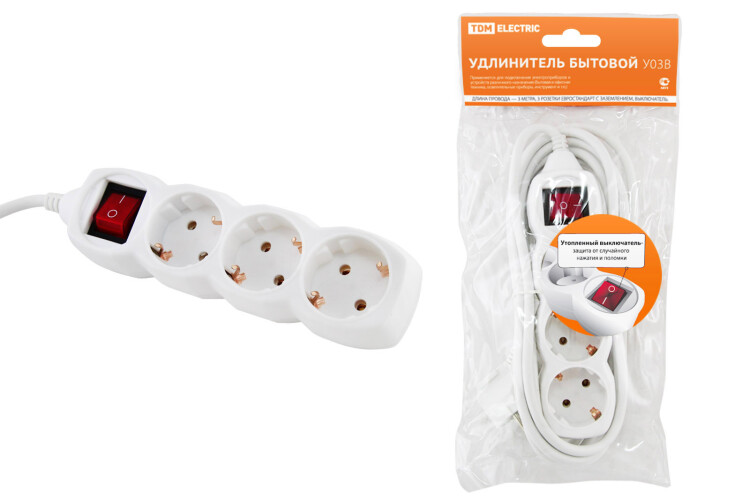 Удлинитель 3 гнезда с/з 3м с выключателем 16А 250В (ПВС 3х1мм2) белый TDM (20шт)