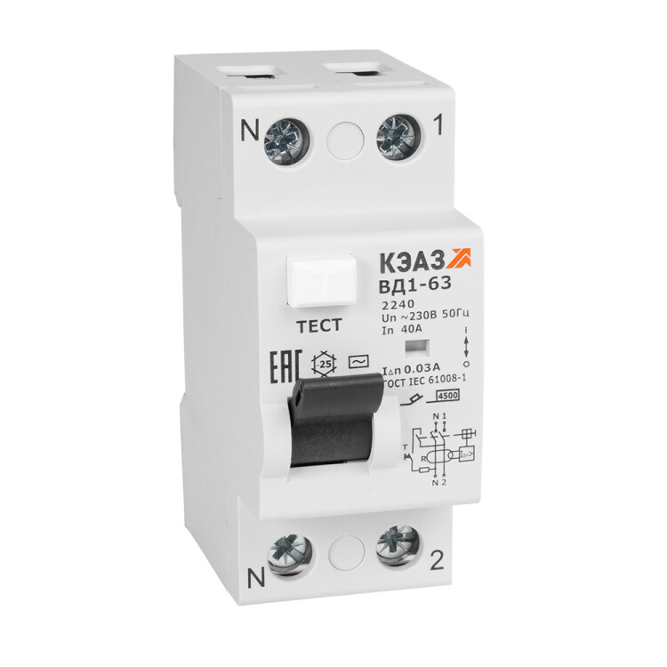 Двухполюсное устройство защитного отключения на номинальный ток 25 А, номинальный отключающий дифференциальный ток 30 мА и рабочее напряжение переменного тока 230 В.